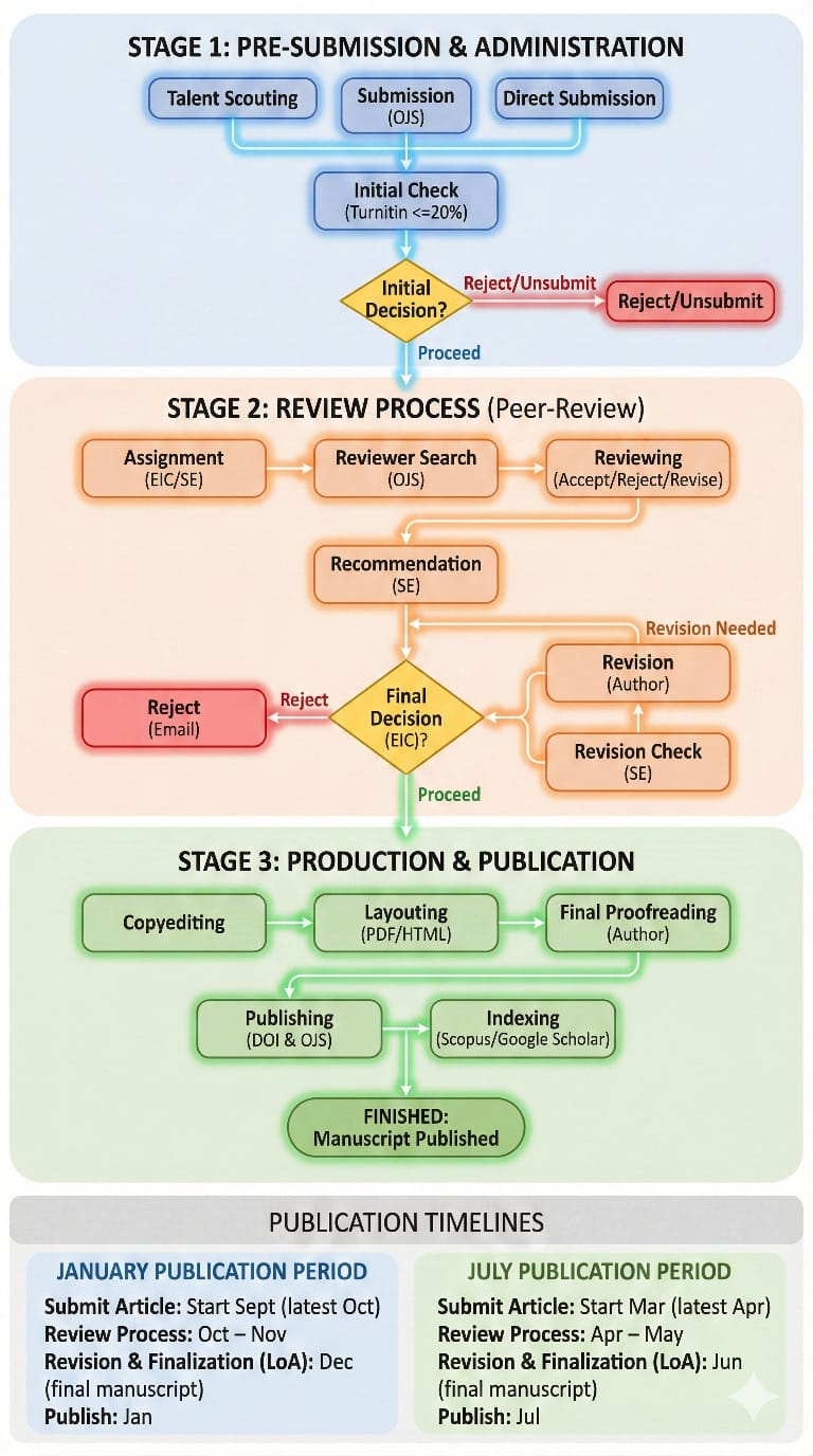 - Final Decision: After reports from reviewers are received, the Editor will evaluate their recommendations and make the Final Decision. The decision can be: Accept, Minor Revision, Major Revision, or Reject. Full authority for this final decision rests with the Editor, and the decision is absolute.